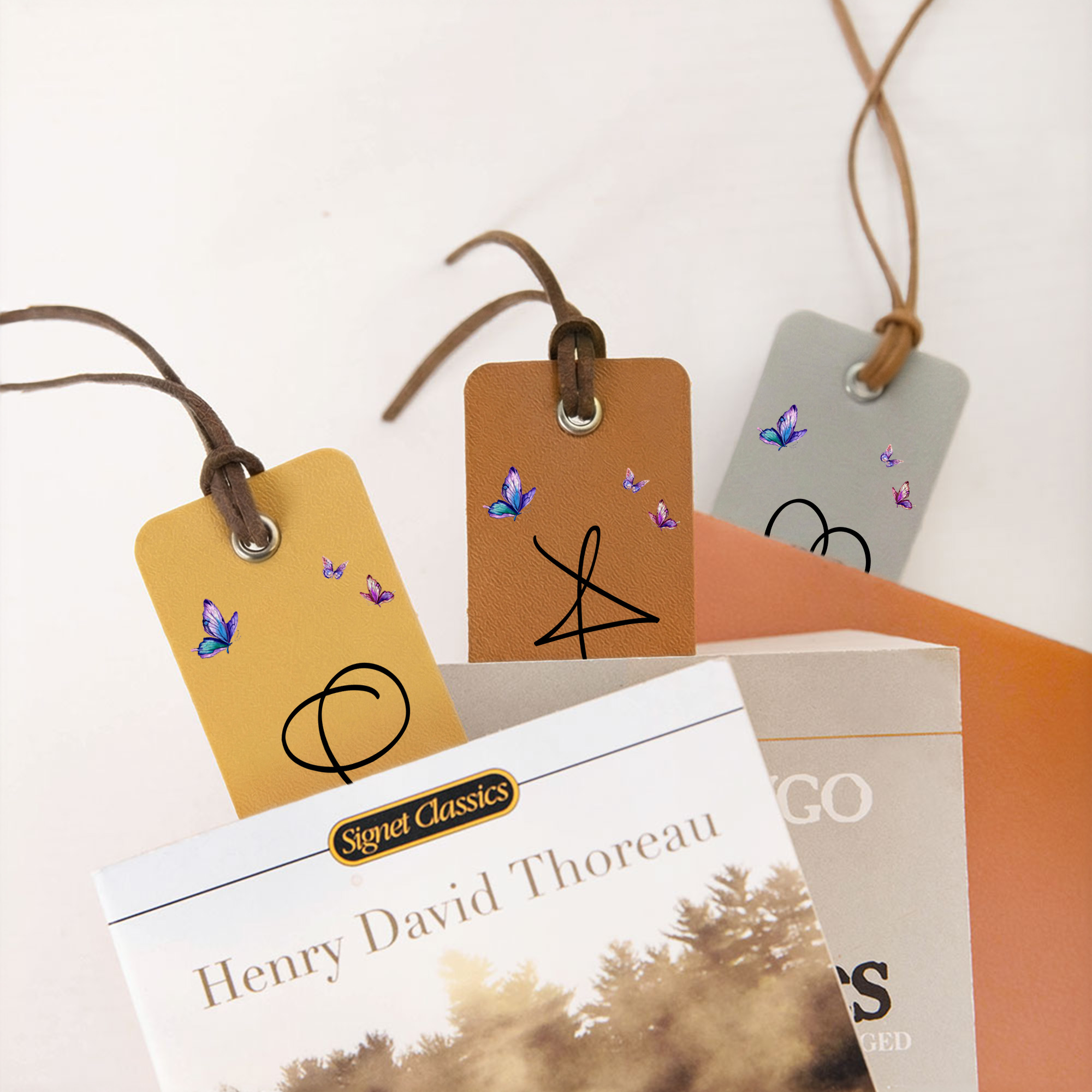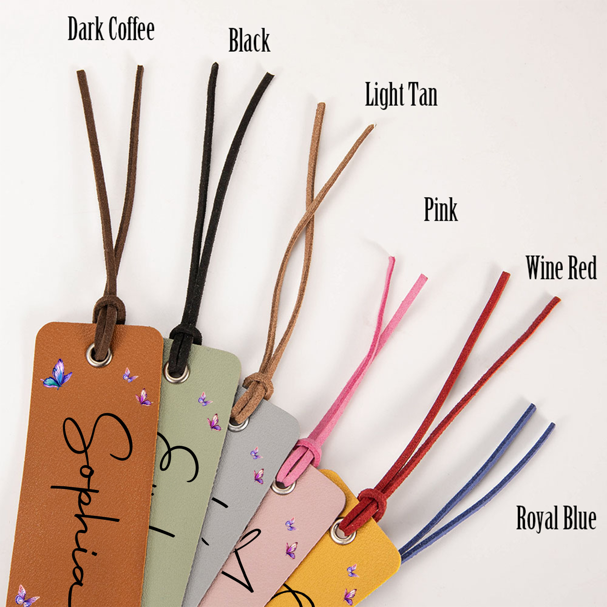 Elegant Birth Flower Design - This leather bookmark features a watercolor birth flower on a book paired with butterflies, symbolizing growth, beauty, and personal stories. The slim shape slips easily between pages, while the attached strap adds a graceful touch and helps you find your place at a glance.
